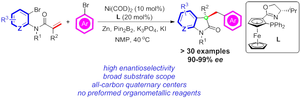 22. Kuai Wang, Zhengtian Ding, Zhijun Zhou, and Wangqing Kong*. Ni-Catalyzed Enantioselective Reductive Diarylation of Activated Alkenes by Domino Cyclization/Cross-Coupling. J. Am. Chem. Soc., 2018, 140, 12364-12368.