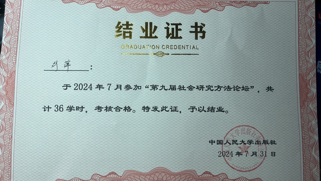 2024年7月28日至8月1日,中国人民大学出版社邀请国内社会研究方法领域的知名专家、学者,于贵州省贵阳市举办了“第九届社会研究方法论坛”。本次论坛共有来自全国来自28个省市,134所院校的240位老师和学生参加,其中线上参会72人。至尊国际公共管理系刘萍老师全程参加了此次会议,积极参与互动,并获得了本次论坛的结业证书。社会研究方法作为发现社会、探究社会的利器,是社会科学研究的重要工具。国内高校 和科研机构对社会研究方法愈发依赖,尤其在新一代信息技术、人工智能快速发展的背景下, 如何面向新情况更好地开展社会研究,更成为广大科研工作者的重要关切。秉承“服务高等 教育事业,服务一线任课教师”的宗旨,为了进一步促进对社会研究方法的交流和研讨,提 升研究者运用社会研究方法的能力与技巧,人大出版社组织了此次论坛。本次会议议程及主讲人情况介绍如下:
