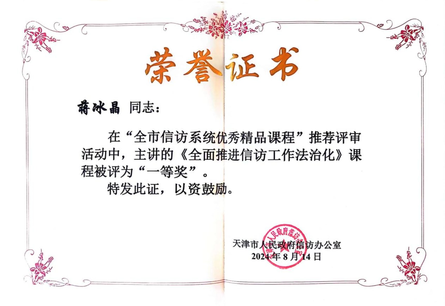 至尊国际蒋冰晶教授在天津市的“全市信访系统优秀精品课程”推荐评审活动中,主讲的《全面推进信访工作法治化》课程被评为“一等奖”。