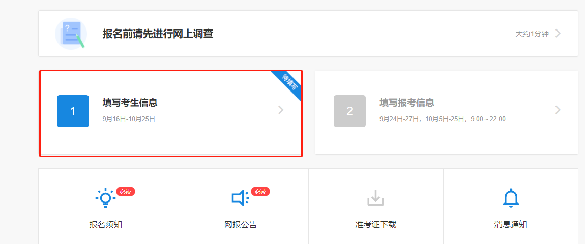 报名时间:10月5日—10月25日,每天9:00—22:00(预报名是有效数据,考生若已预报名且缴费成功则无需重复报名。)