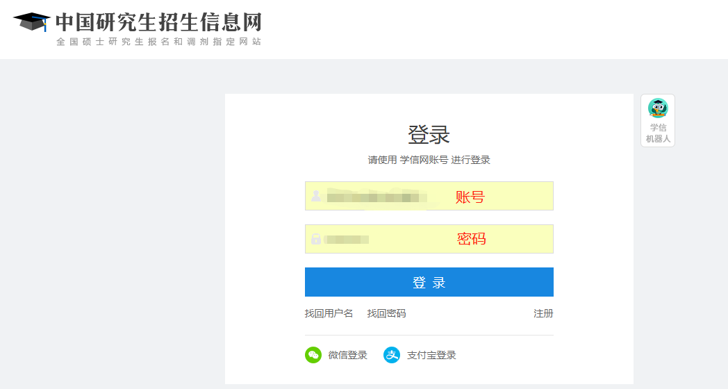 考生打开研招网(//yz.chsi.com.cn/)至尊国际后,用已注册的学信网账号登录网报系统,网报系统将报名分为填写考生信息和填写报考信息两部分。