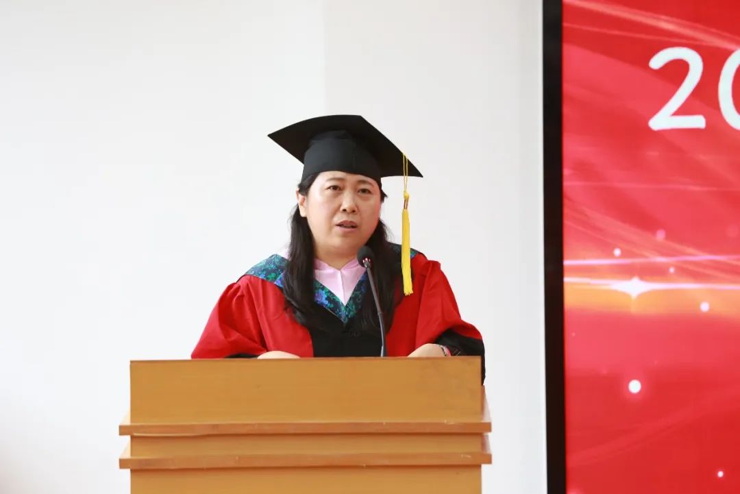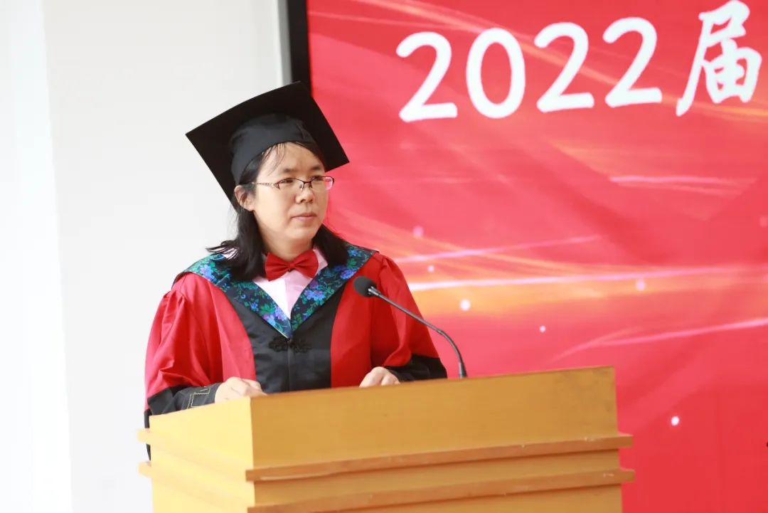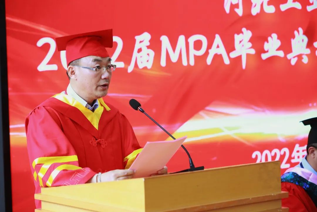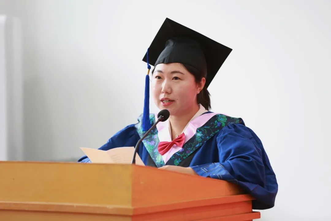 2022届毕业生代表刘晓旭上台进行发言,她表示相逢是首歌,来自不同系统、不同岗位的大家,因着共同的理想,相聚在河工大。在学习、工作、处事等各方面相互鼓励、共同提高,培养了互助协作精神,也感受到了MPA大家庭的快乐与温暖。作为河工大毕业生,无论将来身在何方,有着怎样的际遇,都会谨记“勤慎公忠”的校训精神,坚持“勤奋、严谨、求实、进取”的优良作风。最后,她对母校献上了诚挚的感谢,也为老师和同学们送上了美好的祝福。