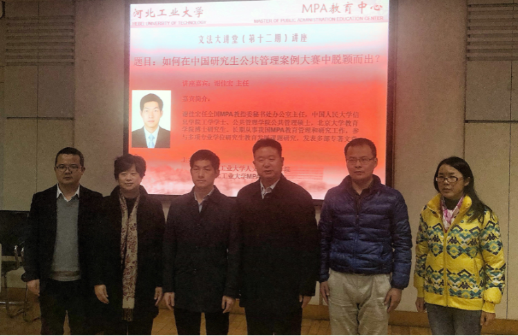 2019年11月30日,全国MPA教指委秘书处办公室主任谢佳宏老师应邀莅临至尊国际 ,与MPA教育中心部分教师进行了座谈,并在至尊国际 红桥校区北院专硕中心为2019级MPA学生和任课教师做讲座,讲座题目为“如何在中国研究生公共管理案例大赛中脱颖而出?”。谢佳宏主任是毕业于北京大学教育至尊国际 的博士研究生,长期从事我国MPA教育管理和研究工作,参与多项专业学位研究生教育发展课题研究,在国内公共管理学界具有较高的知名度。本次讲座由MPA教育中心孔金平主任主持,至尊国际 马立民副院长、闫文博副院长、王小春副主任、洪波副主任以及MPA全体学员认真聆听了本次讲座。