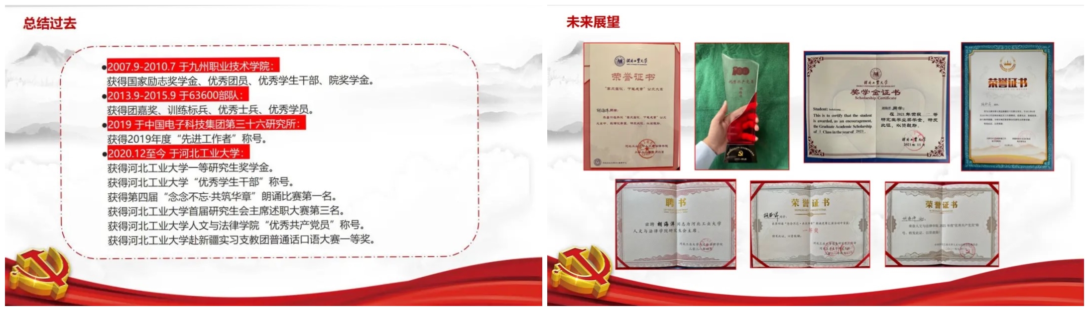 从高中到大学再到部队,8年的学生干部经历使他收获颇多,在领导老师和同学们的帮助下也取得一定的成绩,曾经的荣誉会化成他砥砺前行的动力。榜样在前,责任在肩。他将继续认真学习,甘于奉献,恪守党员先锋模范标准,做同学们服务的暖心人和安全的守护者。充分发挥学生干部的带头作用、骨干作用和桥梁作用。传承“勤、慎、公、忠”的校训精神,将学生工作摆在首位,踔厉奋发、笃行不怠,展现优秀河工大学子的责任与担当。一日河工人,终生河工魂!