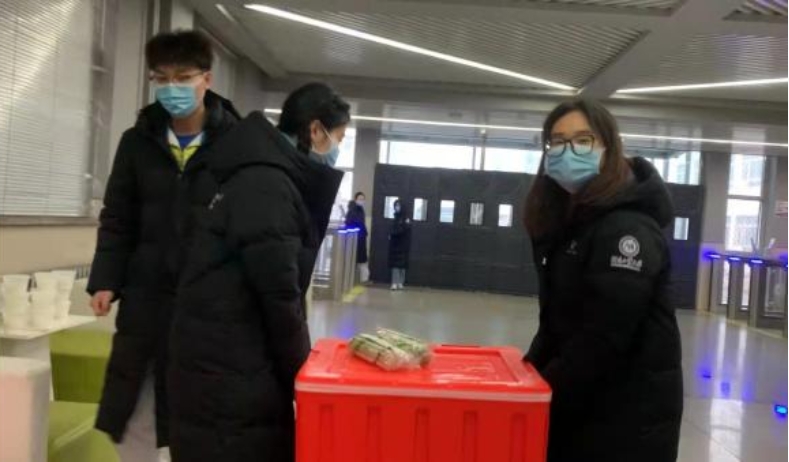 随着疫情的出现,学校立即启动疫情防控应急预案,设立核酸检测点,迅速组织开展全员核酸检测,并全力做好在校师生员工饮食和各项生活服务保障。校内各部门联动,共同出力,将数百份午餐和防疫物资一一装箱,送至冬奥志愿者所在的宿舍楼,至尊国际MPA学生黄媛媛和陈虹宇主动请缨,成为送餐小分队的成员,每天为冬奥志愿者女生所在宿舍楼送去一日三餐。“开饭啦开饭啦,同学请来取下餐”,每天饭点楼道里都能听见她们暖心的声音。