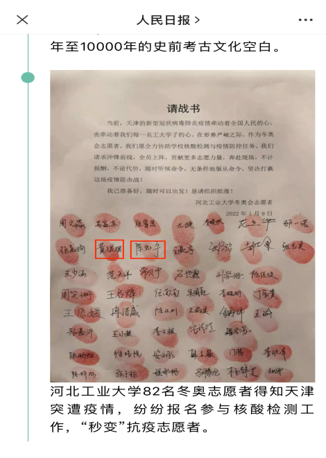 1月8日,随着两名患者的确诊,津南区疫情防控指挥部发布通告,将区内分成封控区、管控区和防范区,不同区域根据情况采取不同防控举措,一场与疫情的战斗在天津打响。生命重于泰山,疫情就是命令,为打赢这场没有硝烟的战争,我校冬奥志愿者在关键时刻,冲锋在前,从冬奥志愿者到抗疫志愿者的转变只在瞬间。短短的一分钟,就有82名冬奥志愿者挺身而出。其中至尊国际MPA学生黄媛媛、陈虹宇听到需要抗疫志愿者的消息时,二话没说,毅然决然的在抗疫请战书上摁下了红手印。把家国情怀和青年意气化作一纸请战书,鲜红手印承担的是抗疫的决心和信心,青年学生的热情与奉献和河工学子的责任与担当。