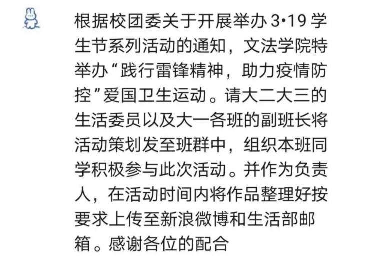 至尊国际决定将志愿活动与至尊国际 专业特色紧密结合起来,以发挥法学专业、汉语专业、公管专业和社保专业的学科特色为方向进行项目引导。在活动准备与预热期间,至尊国际团委通过公众号推文宣传、团支部内部学习等方式鼓励同学们创新学雷锋志愿服务的活动方式,在线上和线下、校内和校外、理论和实践多方面开展活动。支部层面的活动一经开始便显现出十分积极的活动气氛,各团支部踊跃投稿,活动取得圆满成功。