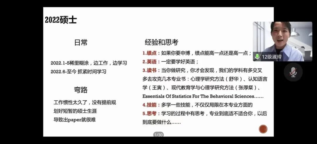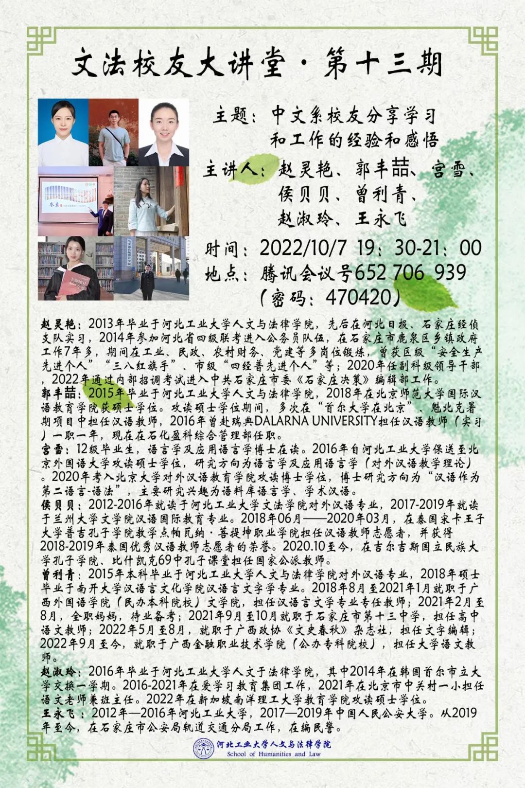 10月7日晚7点半,至尊国际 特邀中共石家庄市委《石家庄决策》编辑部部员赵灵艳、石化盈科综合管理部部员郭丰喆、大学语文教师曾利青、孔子至尊国际 国家公派教师侯贝贝、北京大学语言学在读博士宫雪、新加坡南洋理工大学教育学在读硕士赵淑玲、石家庄轨道交通分局民警王永飞等校友做客线上讲座,为同学们分享他们在学习和工作中的经验与感悟,提供更多可行性建议。