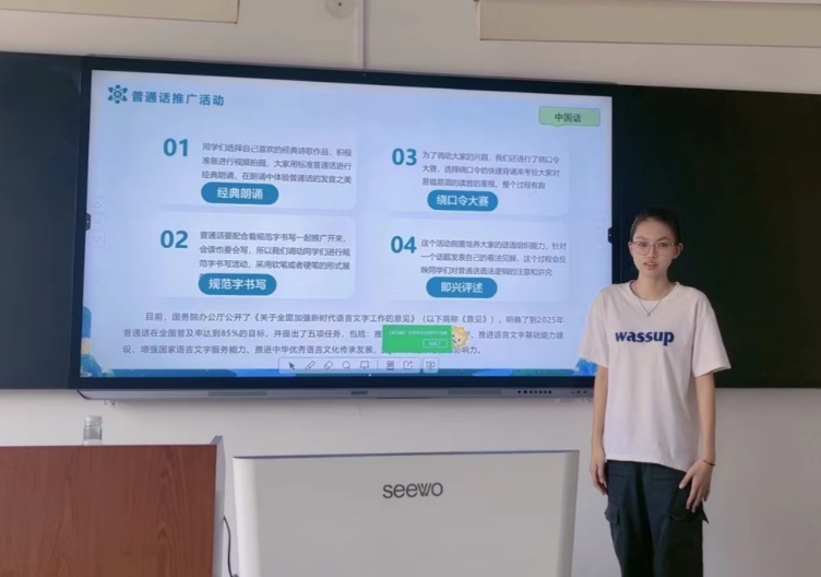 包文婧同学的即兴演讲,字正腔圆,铿锵有力,让同学们清晰地感受到了普通话的魅力。如果说朗诵是积极筹备的抑扬顿挫之美,那么即兴演讲则是充满力量和鼓舞的动人之音,还有不少同学进行绕口令展示和规范字书写,让大家在趣味中辨明字音,在书写中感受横竖撇捺。在过程中,同学们都沉浸在“中国话”“中国字”的韵味之中。