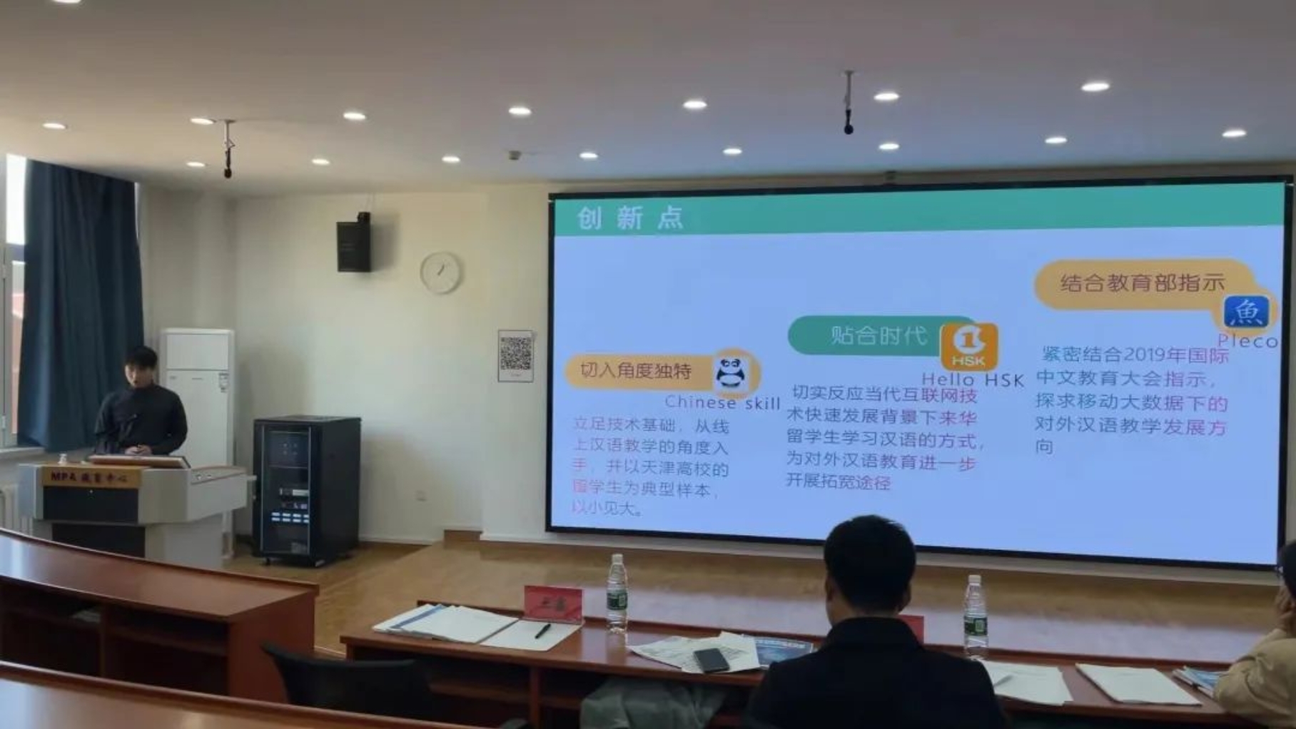 第二支队伍就来华留学生汉语学习方面来阐述项目内容,该队伍立足技术基础,从线上汉语教学的角度出发,以天津高校的留学生为典型样本,切实反映互联网时代下留学生学习汉语的方式,为对外汉语教育进一步拓宽途径,评委老师也对该项目的用户体验及对教师的普及方面进行指导;