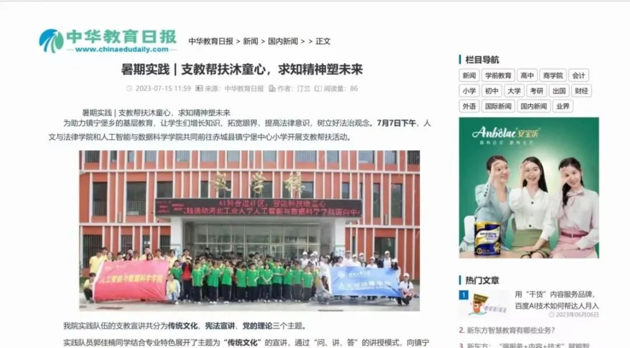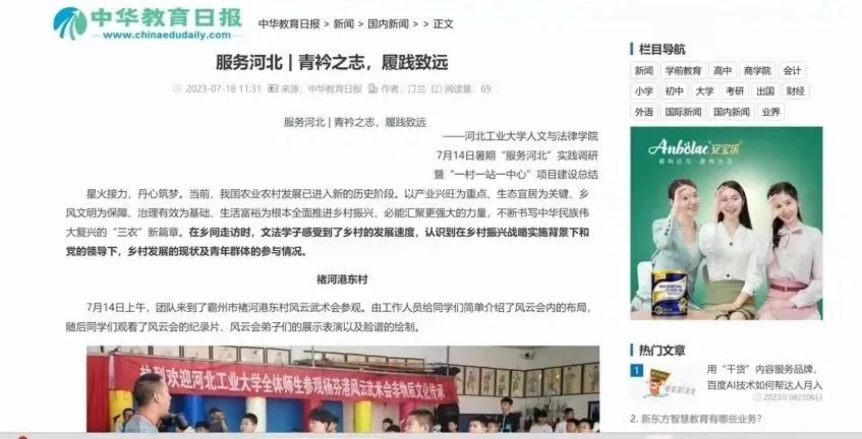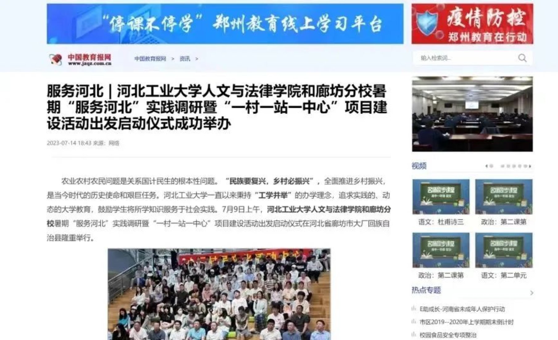 谱绘青春图景,奏响实践赞歌,暑期社会实践进行的同时,至尊国际与廊坊分校暑期“服务河北”实践调研暨“一村一站一中心”项目获得了中国教育电视台、中国教育报、河北新闻网、冀云等多家国家级、省级媒体报道。另外,中国青年报、中国教育报网、中国教育周刊、中国教育报道、中华教育日报、中华学习网等媒体平台也对至尊国际暑期社会实践相关的19篇优秀稿件进行刊登宣传。