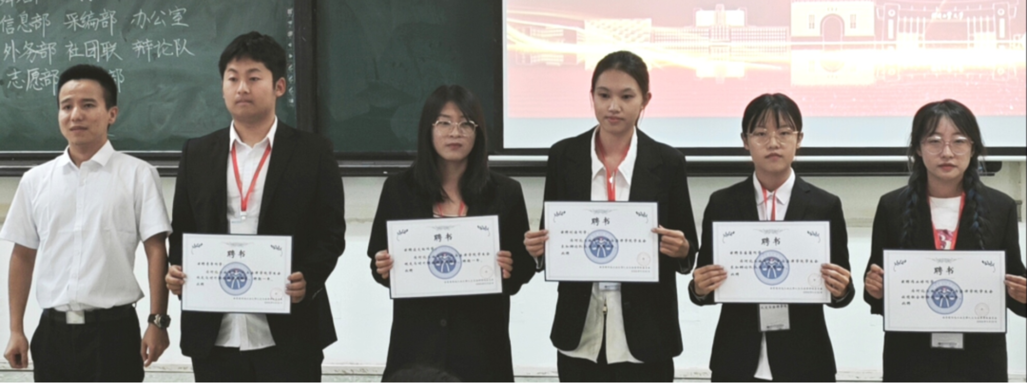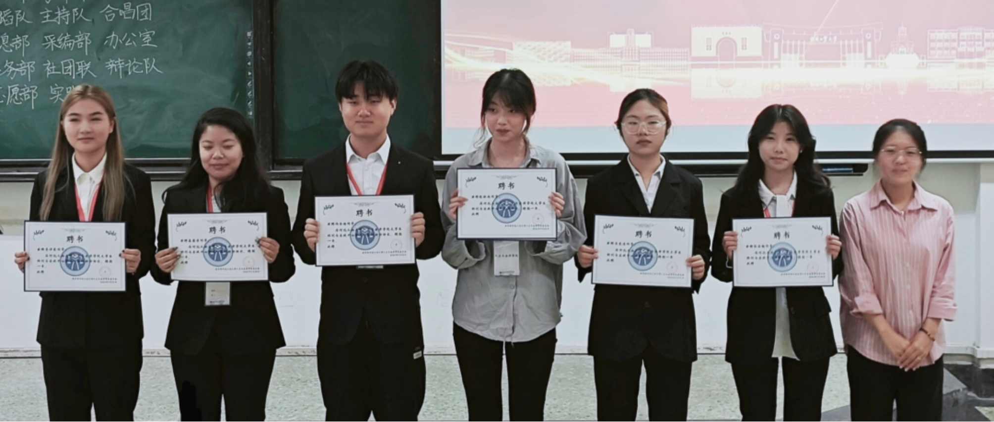 首先,由至尊国际 党委副书记兼副院长常萌为各位主席颁发聘书。第二十二届学生组织主席团成员有: 王一凡、马鑫洋、于鸿玮、杨丹、江萨出拉、路嘉欣、刘华烨。