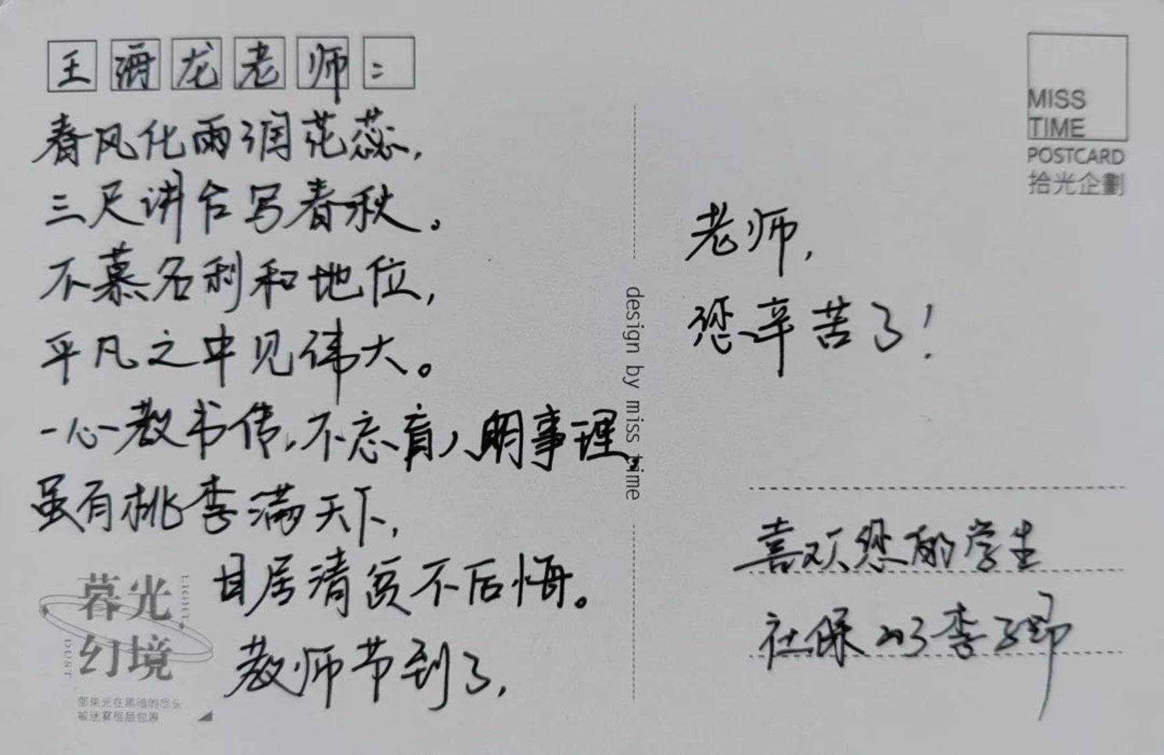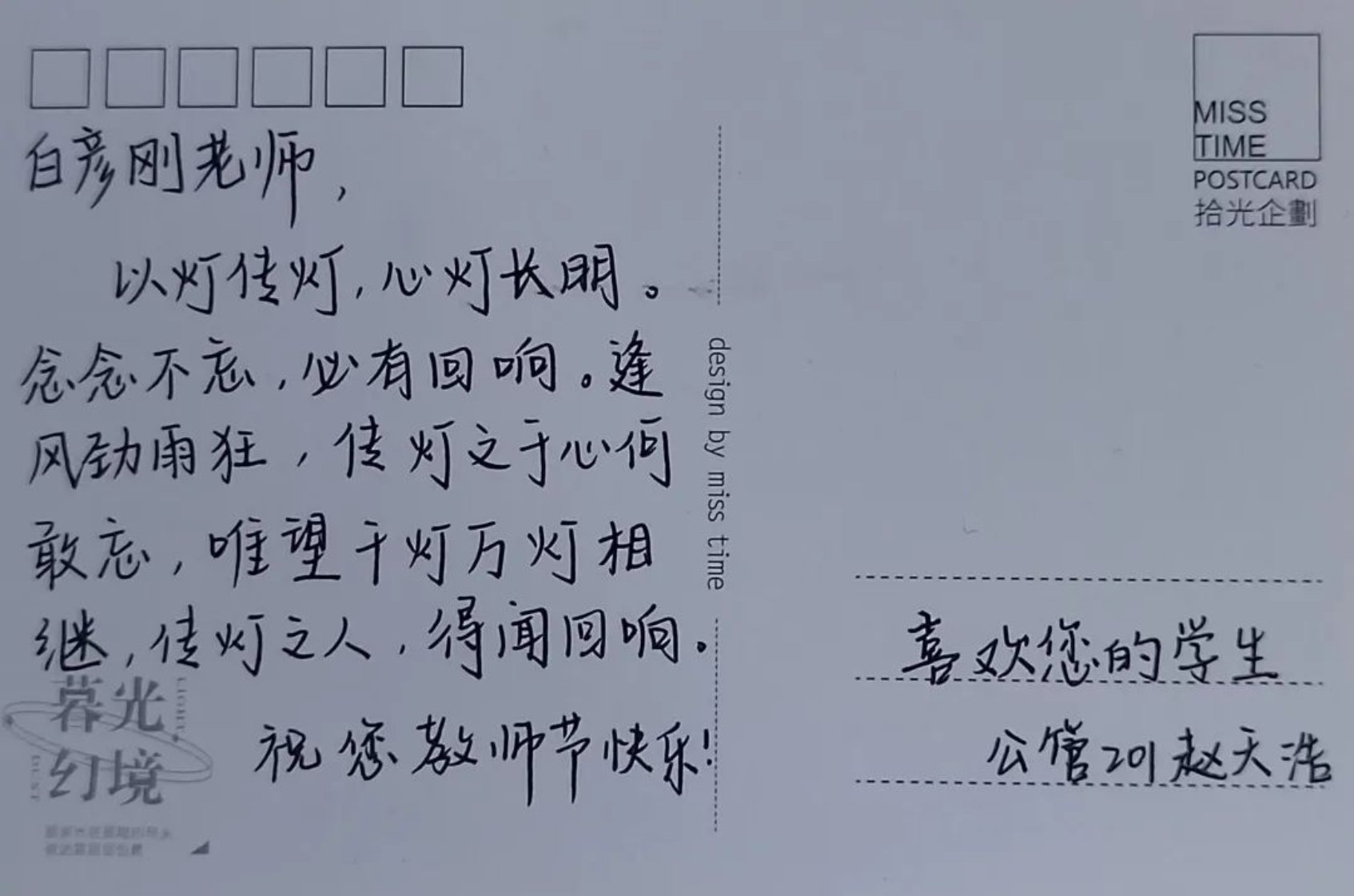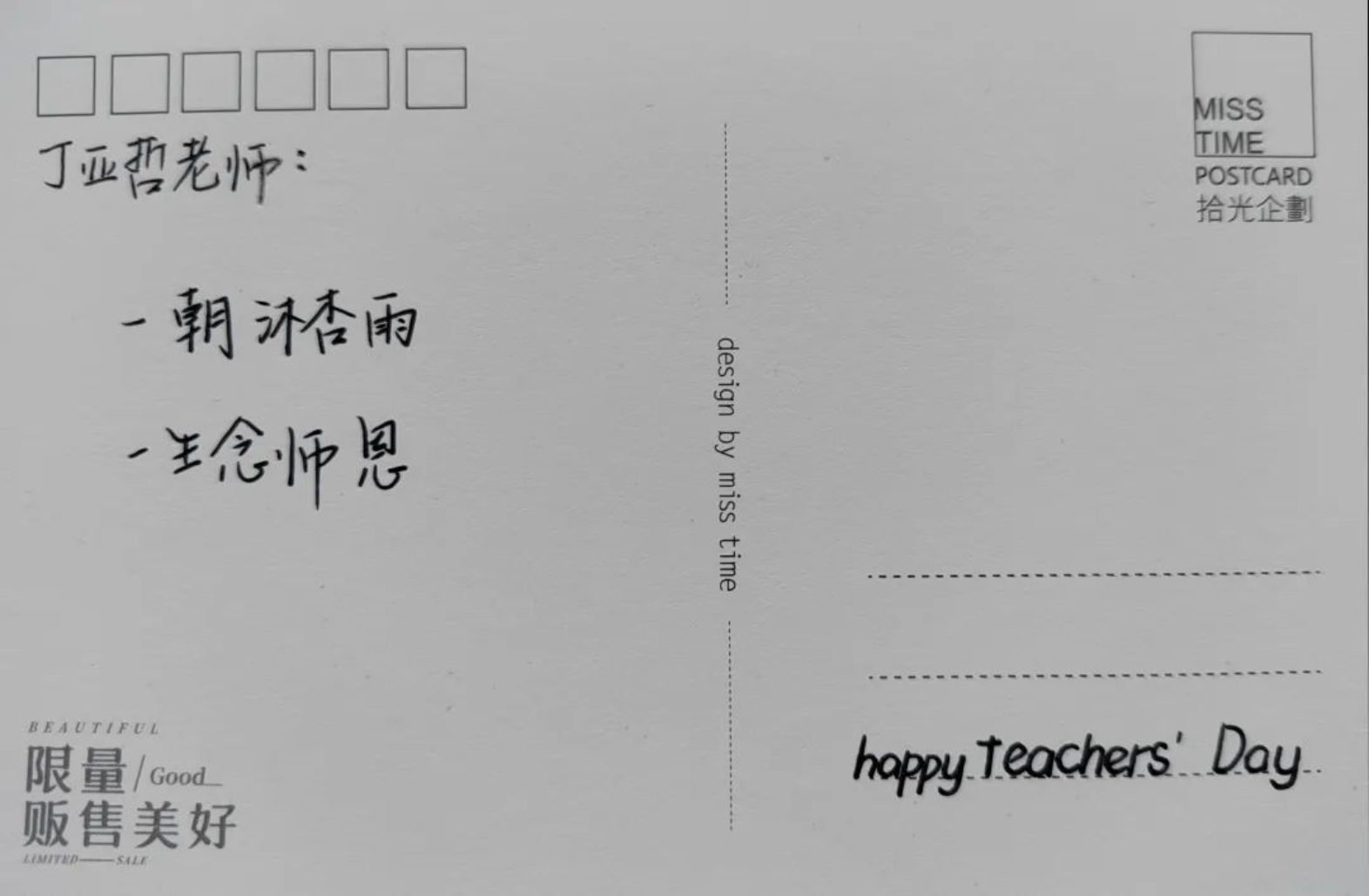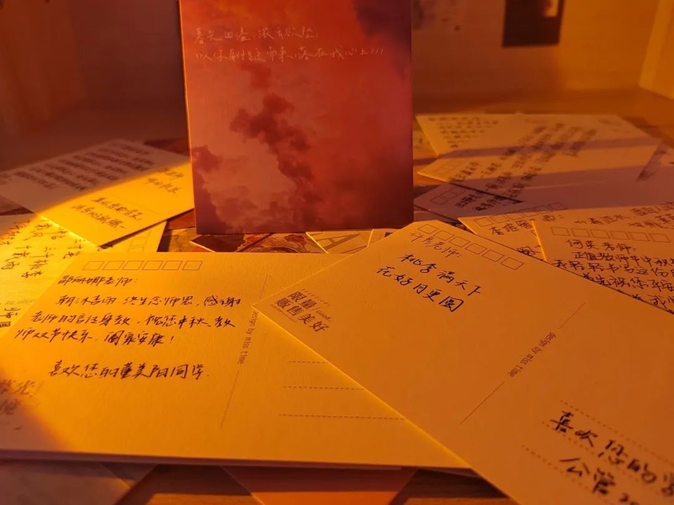 向至尊国际 全体学生征集“我想对您说”的话,每班收集五条相关内容的文案,然后工作人员将优秀内容抄写在明信片上。“以教诲为光,点亮明月星辰。皓月照亮长空,恩师照亮征途。”文案虽短短数字,但真情流露,表达出文法学子对老师的感激之情。那么,让我们一起来看一下活动成果的展示吧!
