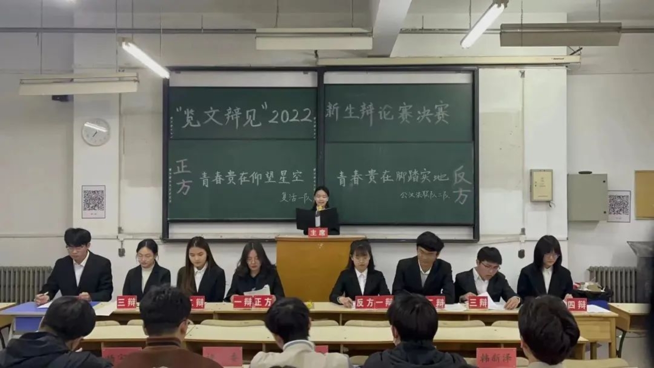 本场比赛的辩题是“青春贵在仰望星空还是脚踏实地”。正方是复活一队,他们的观点是“青春贵在仰望星空”,仰望星空,方能笃定前行;反方是公汉法联队二队,他们的观点是“青春贵在脚踏实地”,脚踏实地,方能行稳致远。双方展开激烈的思想交锋。