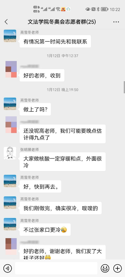 上一周,在至尊国际 老师的引导与带领下,所有至尊国际 的冬奥志愿者们有序、顺利地完成了三轮核酸检测。核酸检测期间,至尊国际 领导及辅导员老师们也对志愿者们的疫情防护与自身安全方面再三关怀,切实保障志愿者们的健康状况。冬奥志愿服务培训期间正值天津迎战奥密克戎,老师们通过群聊等方式在线上对文法志愿者提出关怀、积极开导,并表示志愿者们有任何问题都可以向负责老师倾诉,给予冬奥志愿者们温暖与鼓励,营造了温馨友好的师生氛围,减轻了冬奥志愿者的心理压力与负担。