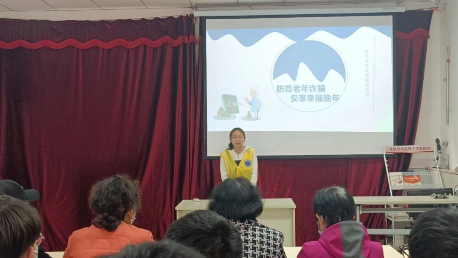 接下来,刘乙漫同学为居民们讲解了老年人反诈指南,针对前面提到的几种养老骗局进行了防诈指示,详细教给大家识别各种骗局以及如何保障自己的人身和财产安全,帮助老年人进一步提高防诈骗意识,预防他们上当受骗。
