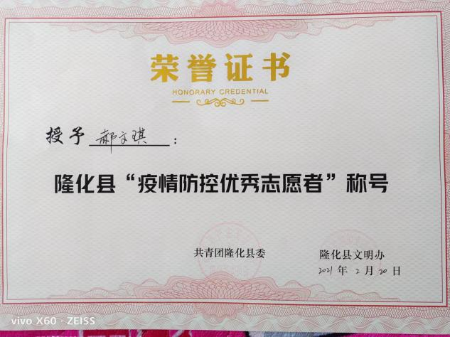 汉语191班郝文琪,在2021年寒假期间参与了社区抗疫志愿活动,帮助社区进行登记信息、测体温、入户排查等工作,并获得“疫情防控优秀志愿者”称号。
