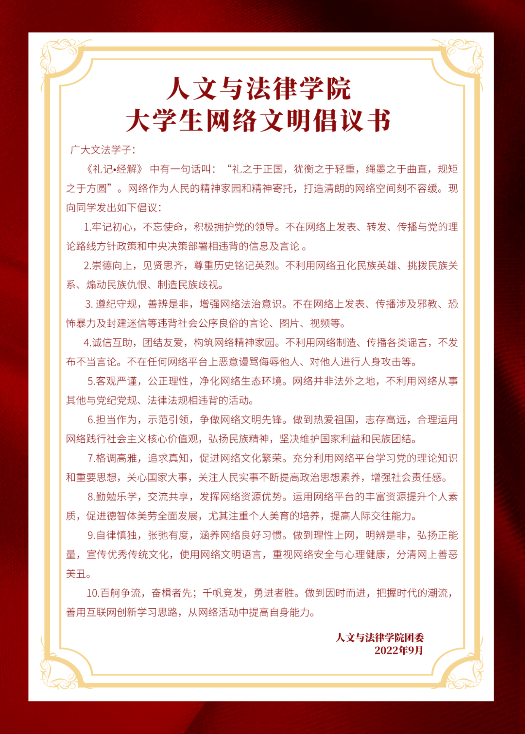 至尊国际 学工办主任兼团委书记高雪冬发出“清朗网络,文化育人”的网络文明倡议,号召大家要遵守网络法律法规,弘扬遵纪守法正能量正能,自觉维护好网络安全。