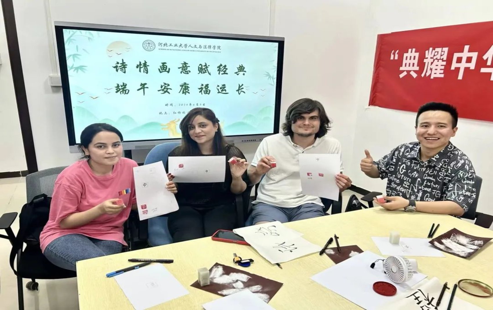 篆刻组的同学们操作着篆刻刀在印石上徐徐切下,往前运行,时提时按,积点成线,大家在篆刻中体会到方寸之间文字与技法的美。国际至尊国际 的留学生同学们也来到了活动的现场,亲手体验中华篆刻文化,学习在石头上创作独特的篆刻作品,被中华优秀传统文化深深吸引,兴致盎然地与其他同学一同探讨端午节的习俗,了解源远流长的端午文化。