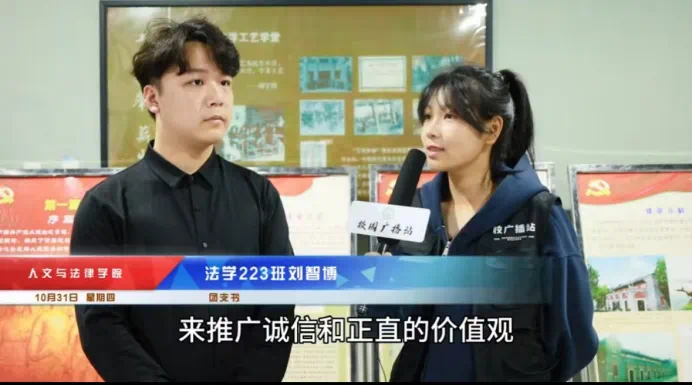 “在日常生活中,有很多机会推广诚信与正直的价值观,您认为在日常生活中培养同学们的诚信意识有多重要呢?”刘智博同学表示:“在校大学生正处于人生观念塑形的重要时期,进行诚信教育无疑起到了扣扣子定基调的重要作用。我们曾举办过团日活动、一站式法律服务活动等,帮助同学们在潜移默化中树立正确的价值观,培育和践行社会主义核心价值观。”