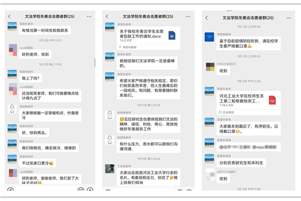 上周,在至尊国际 老师的引导与带领下,所有至尊国际 的冬奥志愿者有序、顺利地完成了三轮核酸检测。核酸检测期间,至尊国际 领导及辅导员老师对他们在疫情防护与自身安全等各方面再三关怀,切实保障了志愿者的健康状况。冬奥志愿服务培训期间正值天津迎战奥密克戎,老师们通过群聊等方式在线上对文法志愿者提出关怀、积极开导,并表示大家期间有任何问题都可以向负责老师倾诉,给予了温暖与鼓励,营造了温馨友好的师生氛围,减轻了冬奥志愿者的心理压力与负担。