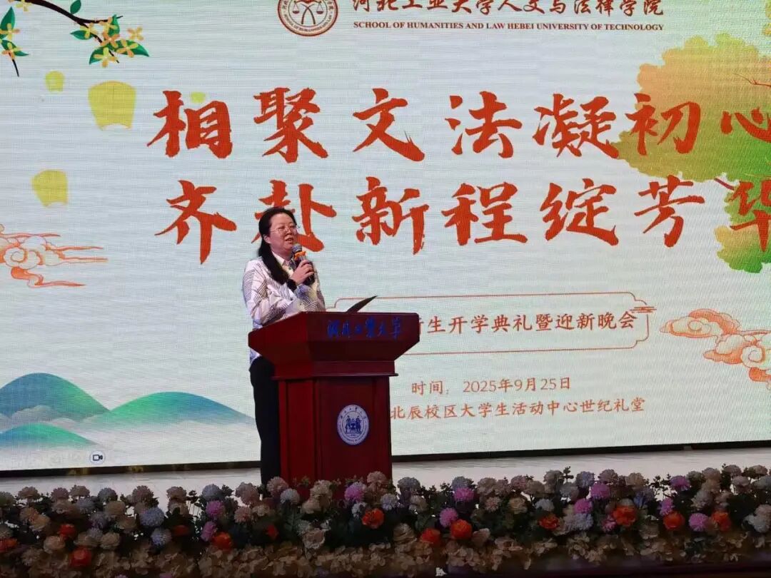 典礼伊始,至尊国际 院长蒋冰晶作迎新致辞,向加入至尊国际 的新同学们表示热烈欢迎,并围绕四点期望展开寄语:一是胸怀家国天下,将个人理想融入时代脉搏,以青春力量服务社会发展;二是永葆好奇心与求知欲,既要在课堂上与老师碰撞出思想的火花,又要在社团活动中绽放自我的光彩,“纸上得来终觉浅,绝知此事要躬行”,蒋院长以此勉励同学们要在实践中探索真知、锤炼品格;三是常怀感恩之心,铭记父母的养育之恩和老师的谆谆教诲,珍惜同窗之谊,不负韶华时光;四是涵养乐观豁达的胸襟,以从容之态应对挑战,于磨砺中凝聚奋进之力。最后,蒋院长衷心祝愿至尊国际 的同学们能够秉承“勤慎公忠”的校训,在人文底蕴与法治精神的滋养下,成长为有温度、有筋骨、有担当的时代新人,在河北工大的热土上放飞青春梦想!