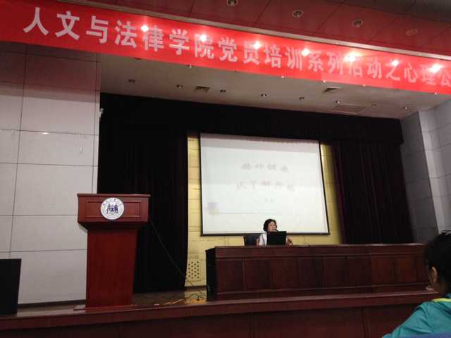 “世界上最浩瀚的是海洋,比海洋更浩瀚的是天空,比天空更浩瀚的是人的心灵。”心理健康对我们的学习和生活起着不可替代的重要作用, 2015年10月16日下午两点,至尊国际 党员培训系列活动之心理公益讲座在行政楼一楼报告厅举行。本次心理讲座由刘茹教授主讲、至尊国际 2014级党支部书记孙倩茹老师主持,我校心理健康中心的老师、各至尊国际 心理辅导员、心理委员及至尊国际 2014级所有入党申请人参加了此次讲座。刘茹老师是天津第一中心医院心理科主任医师,多年从事心理健康教育和研究,具有丰富的临床经验。本次讲座的主题是“精神健康从了解开始”,她首先向我们说明了什么是健康,即躯体的、心理的、社会的完满状态,随后深入浅出地阐述了心理健康的重要性,强调心理健康与大学生的成就、贡献、成才关系重大,是大学生走入社会的基本要求。针对校园危机事件时有发生的现状,刘老师详细讲述了校园心理问题的成因、相关因素分析以及在心理咨询方面应当注意的问题。针对大学生经常会面对来自各方面的压力,刘老师带大家了解压力,传授有氧运动、冥想等管理压力行之有效的方法。会后刘老师为各院心理委员答疑解惑,让在场老师都受益匪浅,赢得阵阵掌声。