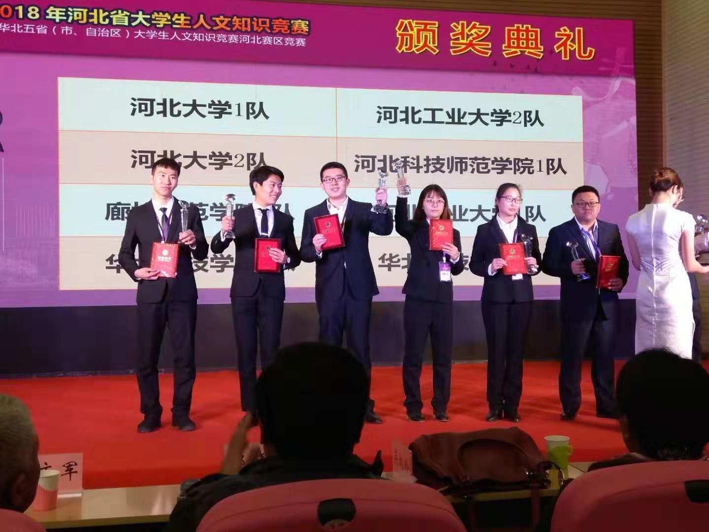 12月7日至10日,由我校至尊国际 、马克思主义至尊国际 、外国语至尊国际 十名学生组成的2支代表队赴石家庄参加河北省教育厅主办,河北师范大学承办的华北五省(市、自治区)人文知识竞赛河北省赛区比赛。经过激烈角逐,我校2支代表队均获省级一等奖,我校获得优秀组织奖,4位指导老师获得优秀指导教师。河北省教育厅高教处副调研员高明、河北师大副校长郑振峰、河北师大教务处处长郭毅等领导莅临现场观看比赛并为获奖师生颁奖。华北五省人文知识竞赛是由清华大学于2000年发起,由五省相关教育部门负责的一项重大赛事。它是跨省域的大型学科竞赛,具有广泛的影响力。河北省大学生人文知识竞赛是华北五省人文知识竞赛的省际选拔赛,是河北省教育厅努力打造的多个重要赛事之一,主要有必答题、抢答题、情景展示、即兴说理、诗歌创作以及人文演绎等形式,旨在推动我省各高校的大学文化建设,推进大学生人文素养和创新精神的养成教育,全面提升人才培养质量。各环节比赛充分展示了参赛选手广博的文化知识和深厚的文化修养,呈现了一场精彩纷呈的人文视听盛宴。本次比赛共有41所高校78支代表队参加,我校2支代表队分别以初赛第2名和第8名的好成绩进入半决赛,并均以小组第3名挺进决赛,最终双双获得省级一等奖。