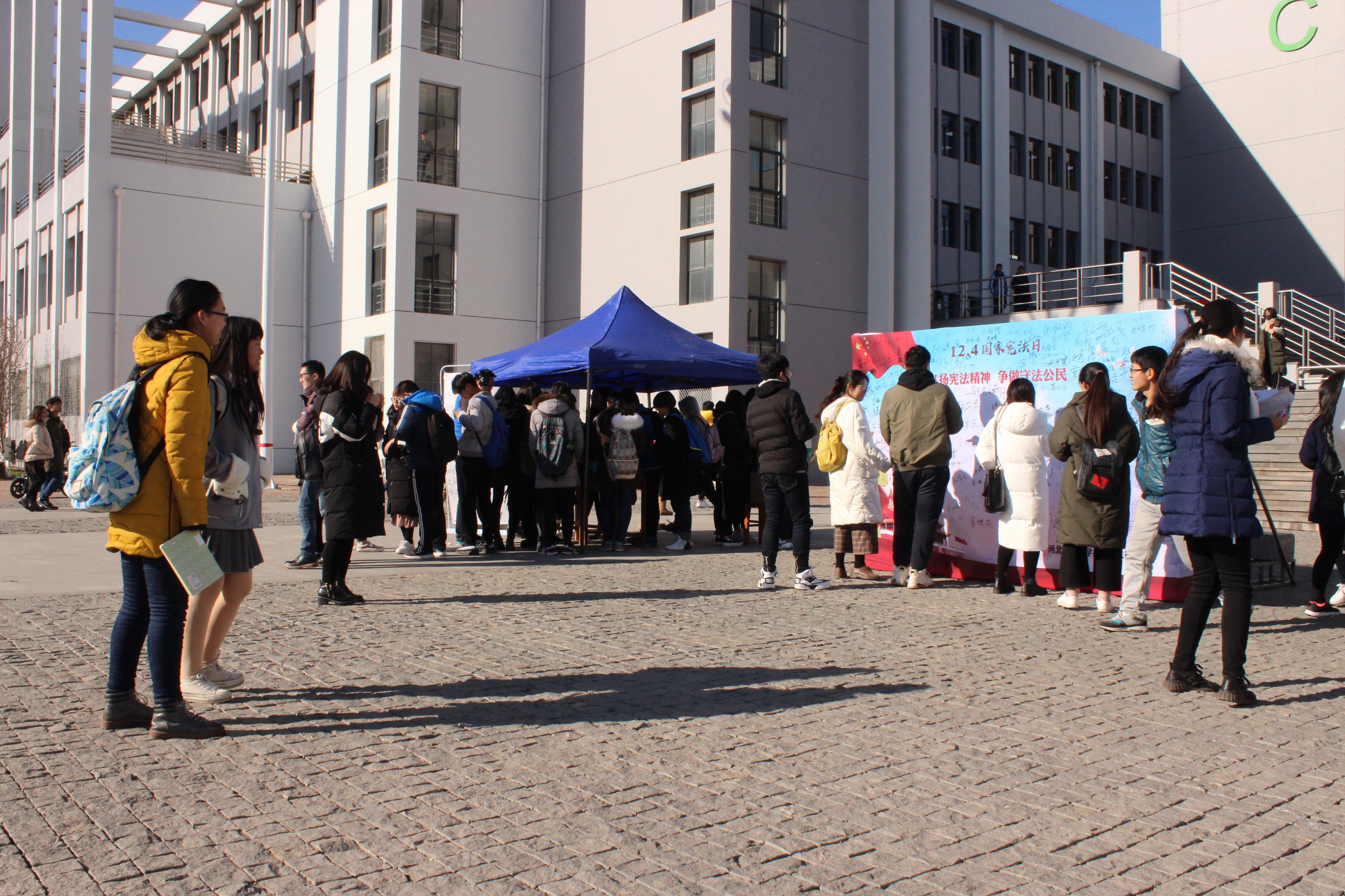 12月4日早7点,由至尊国际 主办,法律英语协会、法律协会承办的“弘扬宪法精神,争做守法公民”主题活动于北辰校区教学楼前举办。此次活动是在党的十九大高度重视法治建设、决定成立中央全面依法治国领导小组、要求“维护宪法权威”、“加大全民普法力度”的大背景下,为响应国家弘扬宪法精神,普遍开展宪法教育的号召而开展。本次活动具有重要现实意义,吸引全校师生参与。为了活动的顺利开展,工作人员不辞辛劳,秉承着对宪法的崇高敬意和饱满热情,在凛冽的寒风中为大家服务。全校众多师生在签字板上签名支持,留下“弘扬宪法精神,争做守法公民”的铮铮誓言。此外,为了进一步宣扬宪法知识,设置宪法知识有奖问答环节,为答题成功的师生送上精美的纪念礼品,让大家在愉快的游戏中学习宪法知识。