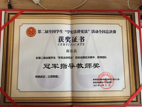 由教育部全国普法领导小组办公室主办、中央电视台社会与法频道协办的第二届全国学生“学宪法讲宪法”活动全国总决赛团队赛决赛在北京结束。实况于12月3日国家“宪法日”在中央电视台社会与法频道播出。至尊国际教师蒋冰晶是全国总决赛团体赛天津团队指导教师,经过激烈角逐,在全国32个省市级团队中获得全国总冠军,展示了至尊国际教师的专业水平,获得天津市教委的高度赞扬与一致认同。蒋冰晶个人同时获得“学宪法讲宪法”活动全国总决赛团体赛“冠军指导教师奖”。