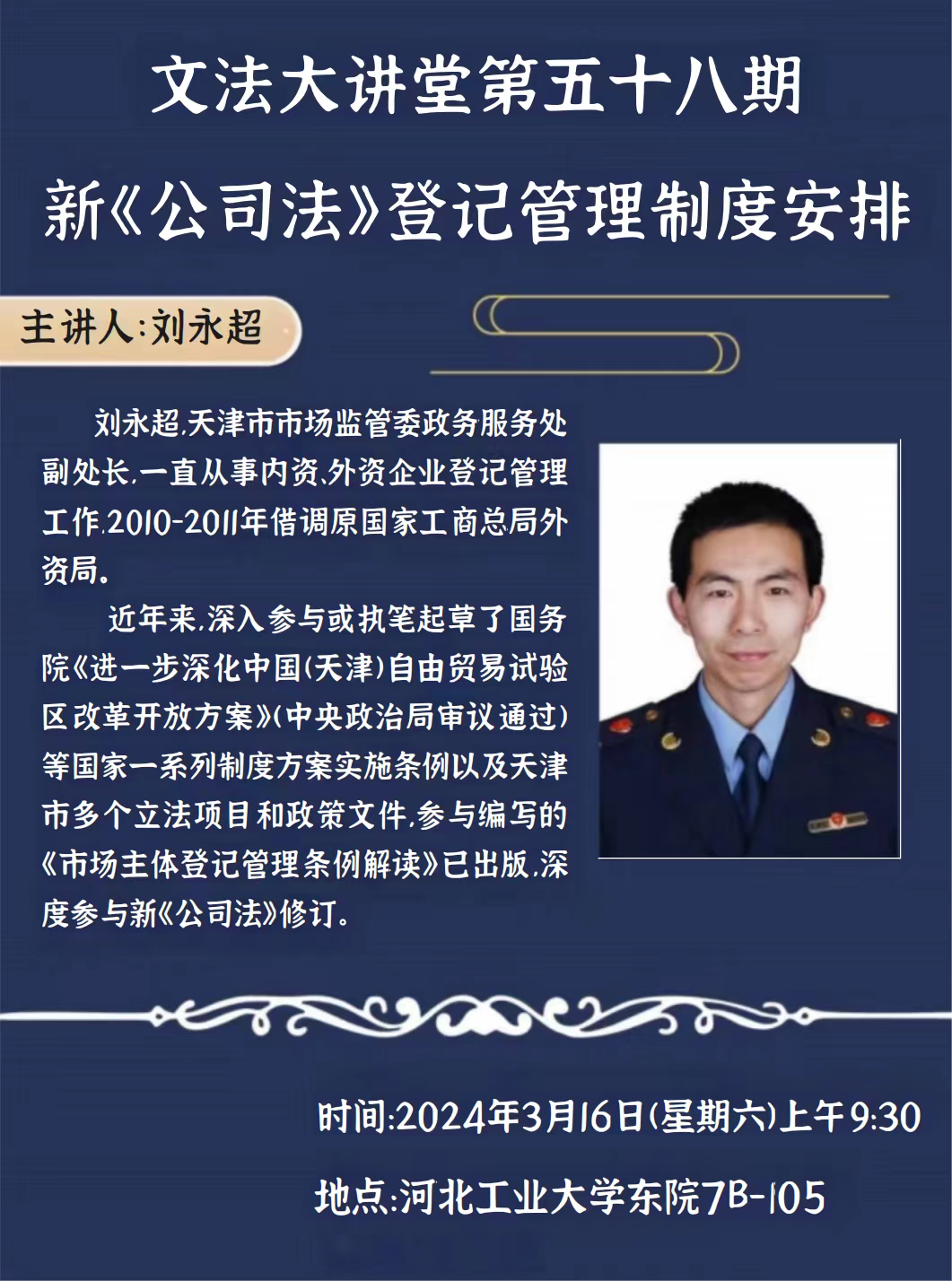 2024年3月16日,至尊国际 邀请优秀校友、天津市市场监管委政务服务处副处长刘永超来我校做客文法大讲堂,开展第五十八期讲座,主题为:新《公司法》登记管理制度安排。