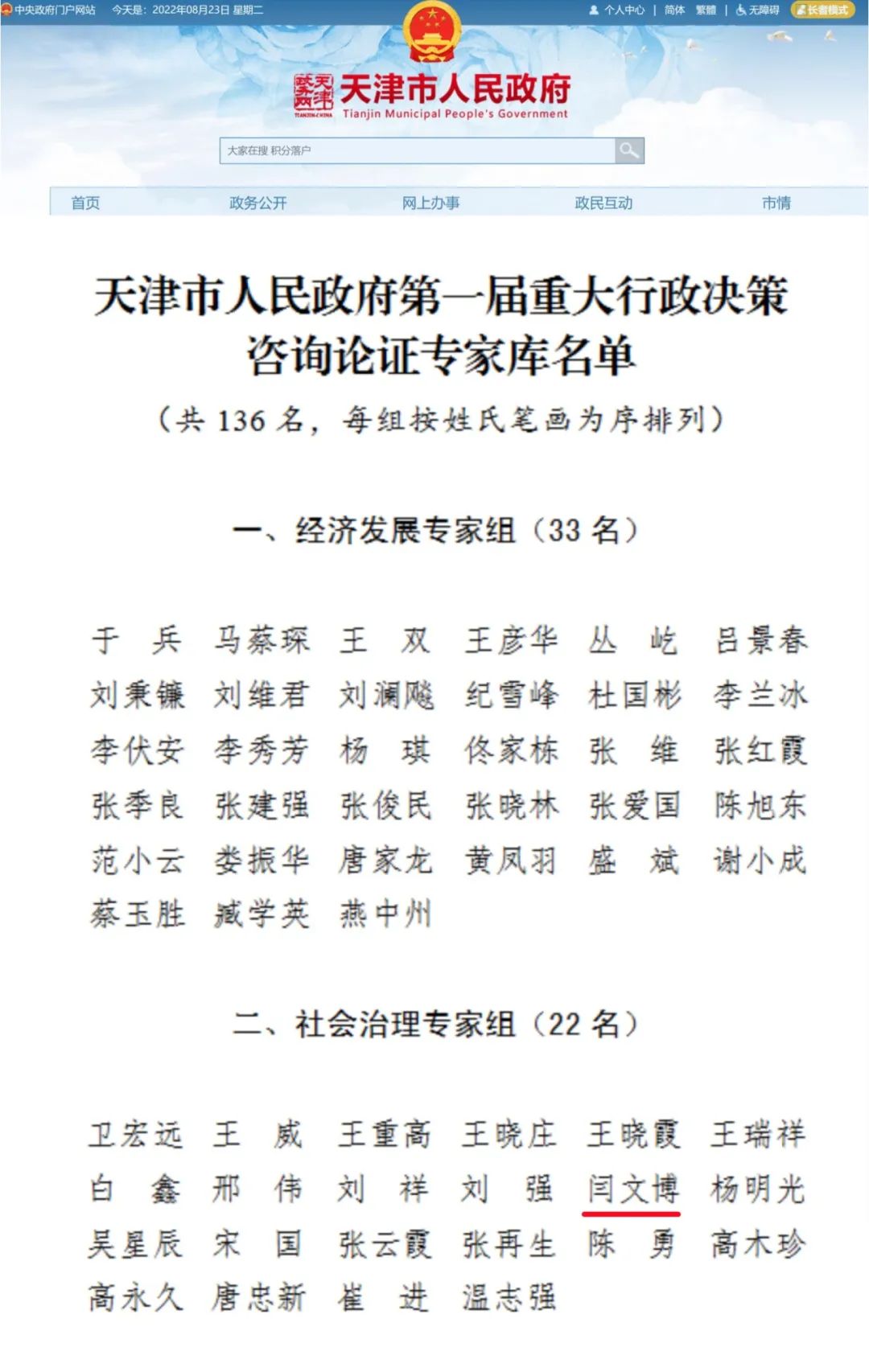 2022年8月17日,天津市人民政府发布《天津市人民政府关于第一届重大行政决策咨询论证专家库名单的公告》,至尊国际闫文博副教授入选天津市人民政府第一届重大行政决策咨询论证专家库-社会治理专家组。