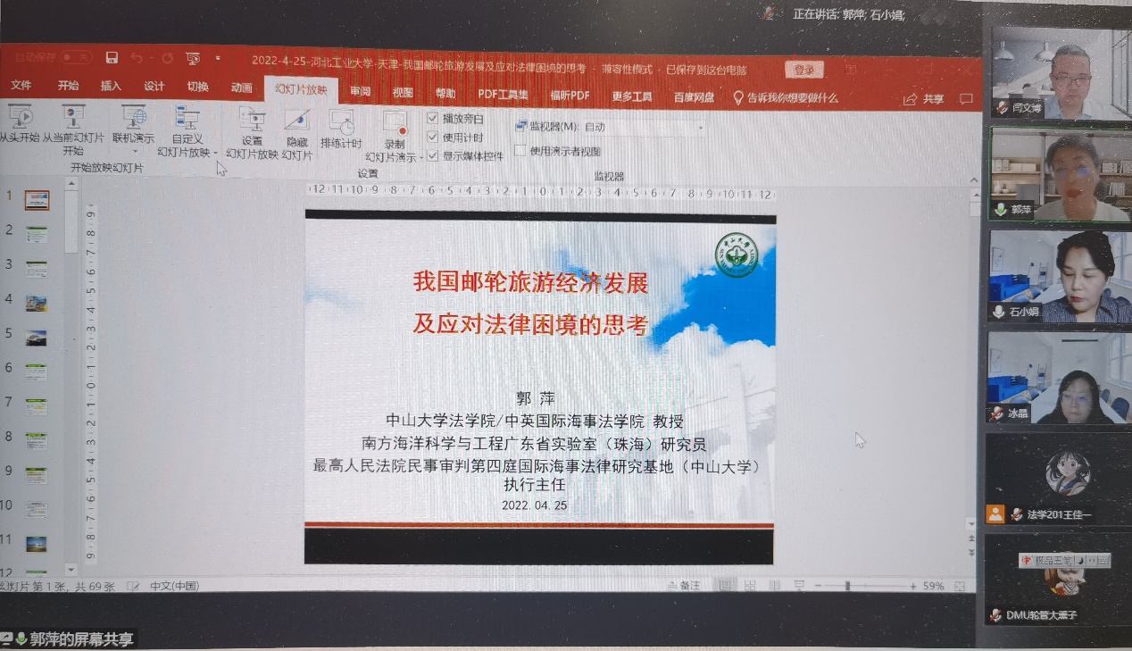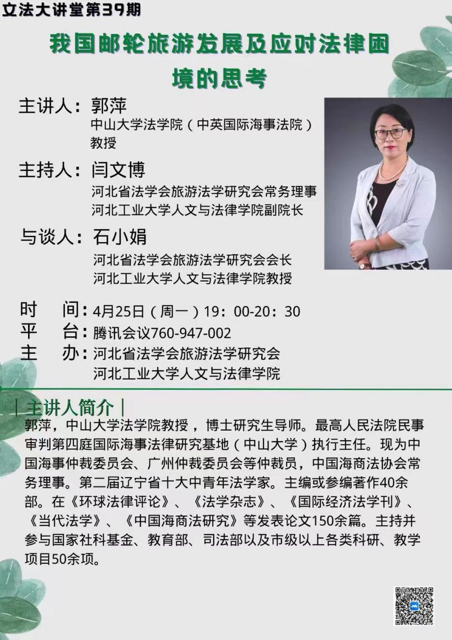 4月25日晚,河北省法学会旅游法研究会、至尊国际 举办了题为“我国邮轮旅游发展及应对法律困境的思考”的线上讲座,主讲人为中山大学法至尊国际 (中英国际海事法至尊国际 )教授、中国海事仲裁委员会仲裁员郭萍。至尊国际师生以及河北省法学会旅游法研究会的会员二百多人一起聆听了本次讲座,本次讲座由河北省法学会旅游法研究会常务理事、至尊国际 闫文博副院长主持。